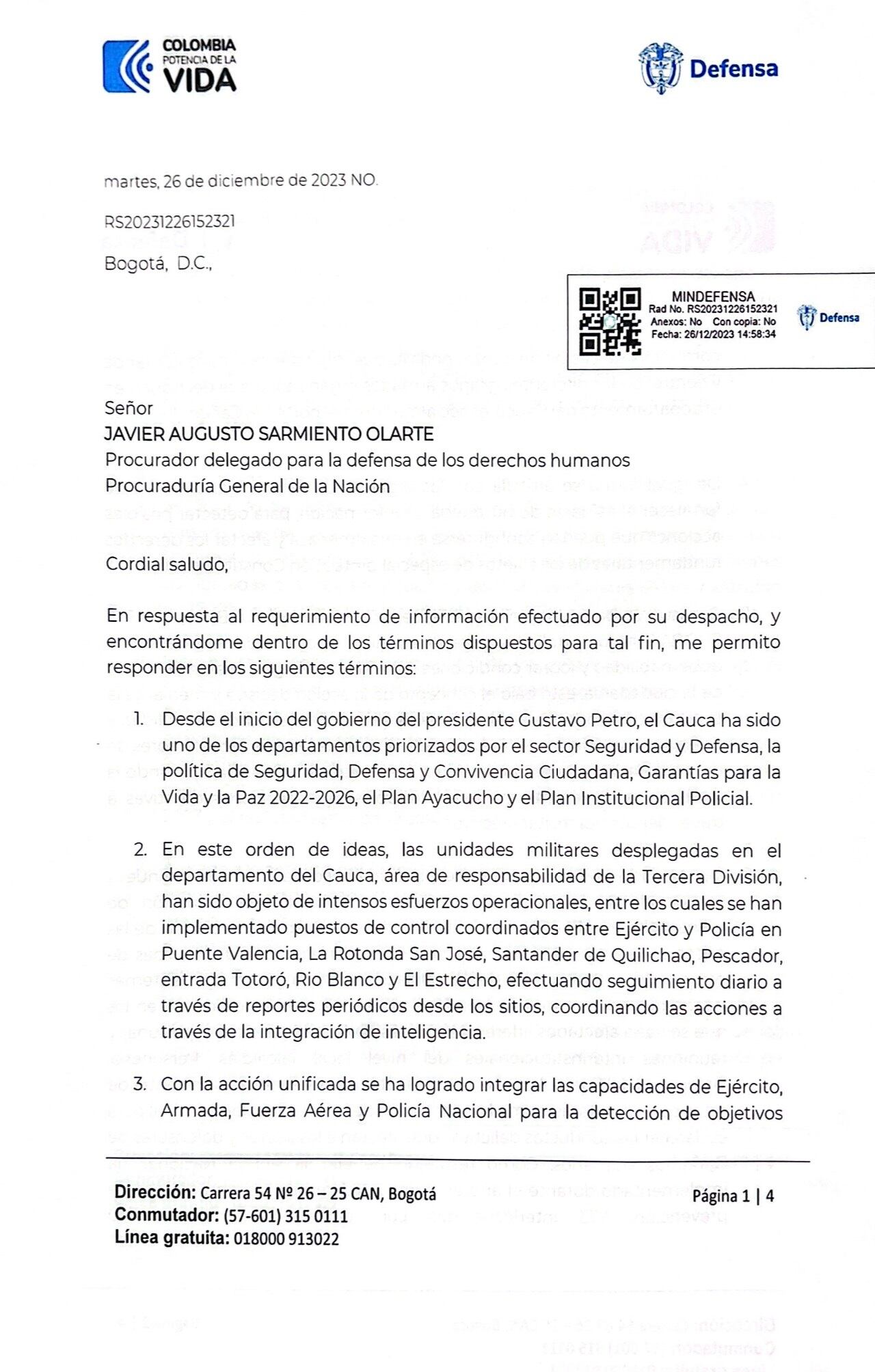 Finalmente, la Margarita Cabello anunció que ha hecho 22 requerimientos al Ministerio de Defensa por la falta de seguridad en el país, el último por la crisis en el Cauca, el cual fue firmado por la viceministra de veteranos: “esperemos haya sido con mucho respeto, pero no importa la respuesta quien la firme lo que importa es el contenido”, dijo Margarita Cabello.