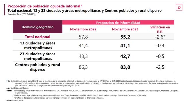 Finalmente, el DANE expuso que la informalidad también sufrió una reducción en noviembre al ubicarse en 55,2%, cifra inferior a la que se registró en el mismo mes de 2022 cuando alcanzó el 57,8%.