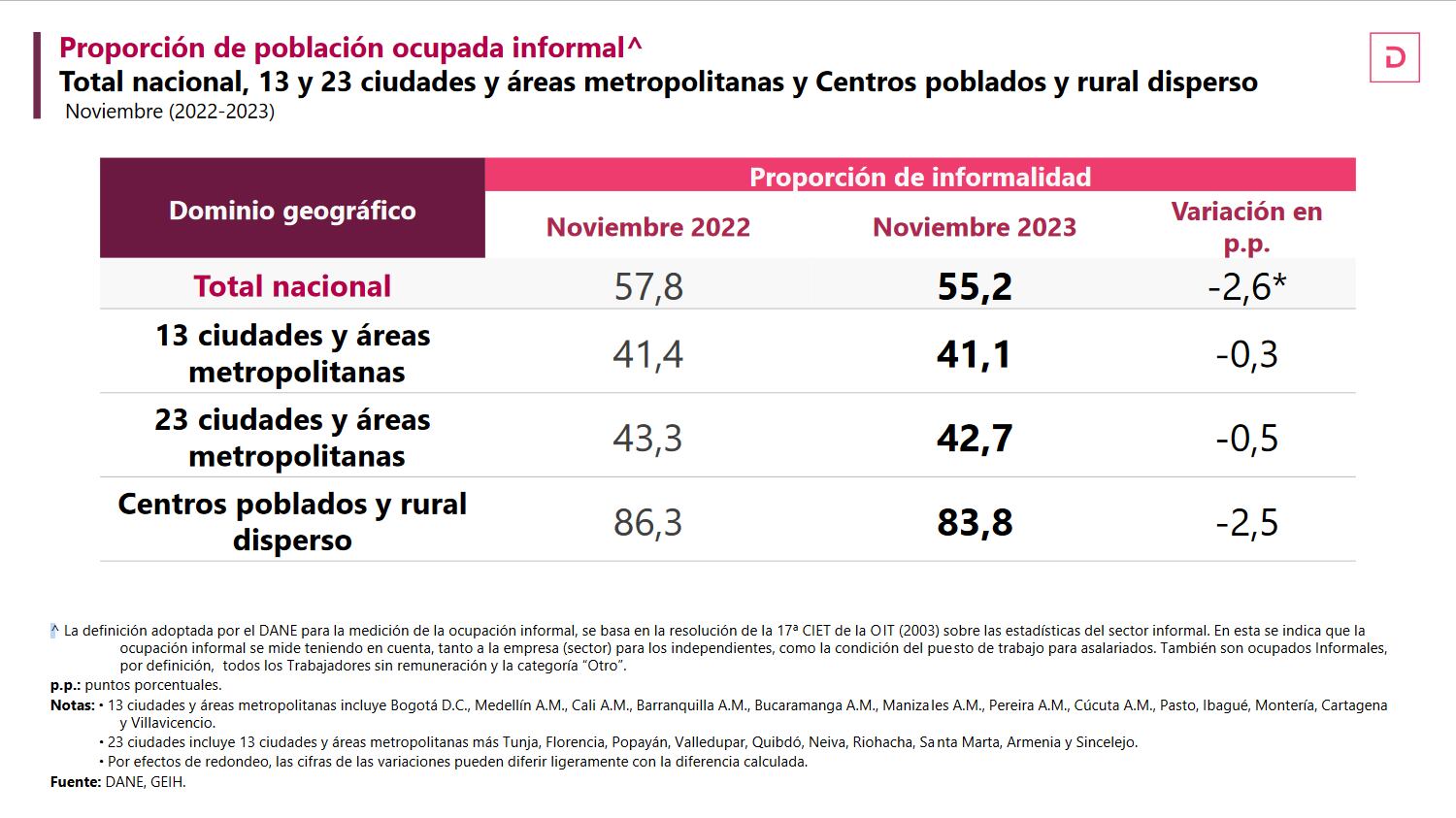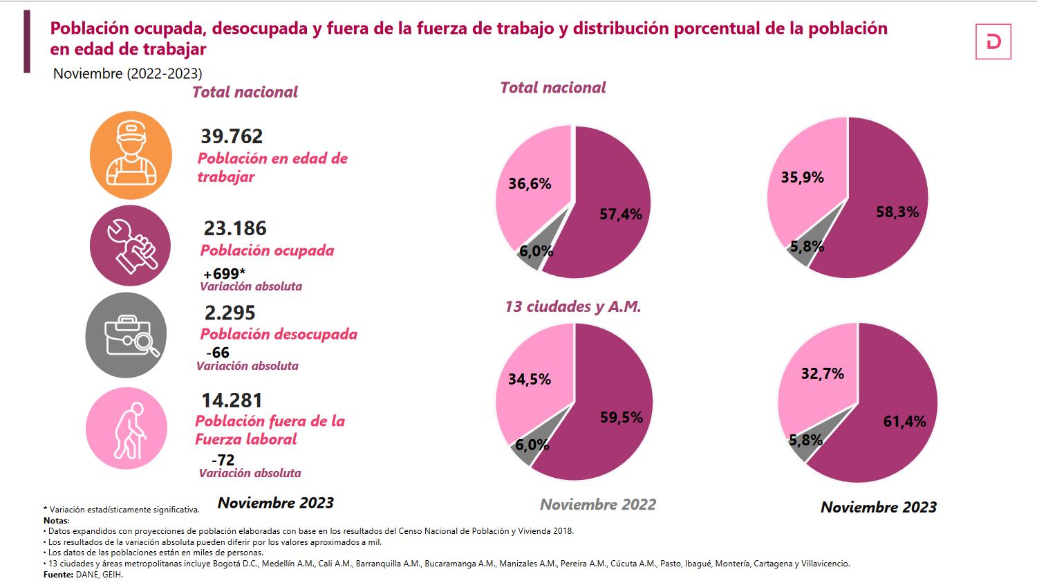 En el informe, la entidad estadística destacó la tasa de desocupación desestacionalizada –la cual permite hacer la medición mes a mes–, en donde expuso que “para el total nacional, la tasa de desocupación desestacionalizada fue del 10,2 %, mientras que en octubre de 2023 fue del 10,0 %. Para las 13 ciudades y áreas metropolitanas, la tasa de desocupación desestacionalizada preliminar fue del 9,9% en noviembre de 2023 y de 9,8 % en octubre de 2023″.
