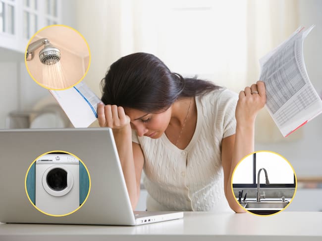 Mujer preocupada al ver por cuánto le llegó el recibo del agua. En los círculos, las imágenes de una ducha, lavadora y lavaplatos / Fotos: GettyImages