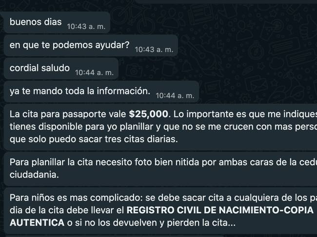 Entre otras cosas también por este medio indicaron cuentas bancarias para realizar los pagos, sedes en las cuales podían sacar citas y advertencias: “Si no se dan cuenta y les envio la información y no van al otro dia pierden la cita y toca sacar una nueva y pagar nuevamente”, decía otro de los mensajes.