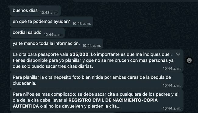 Sigue La W realizó un experimento al llamar a uno de estos tramitadores. En principio, se mostró amigable y manifestó interés en continuar la conversación por WhatsApp, donde proporcionó precios y condiciones: