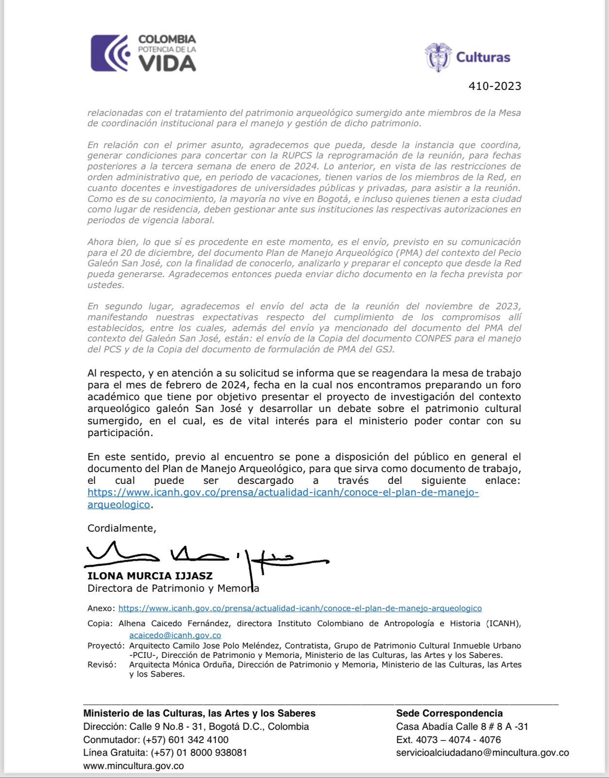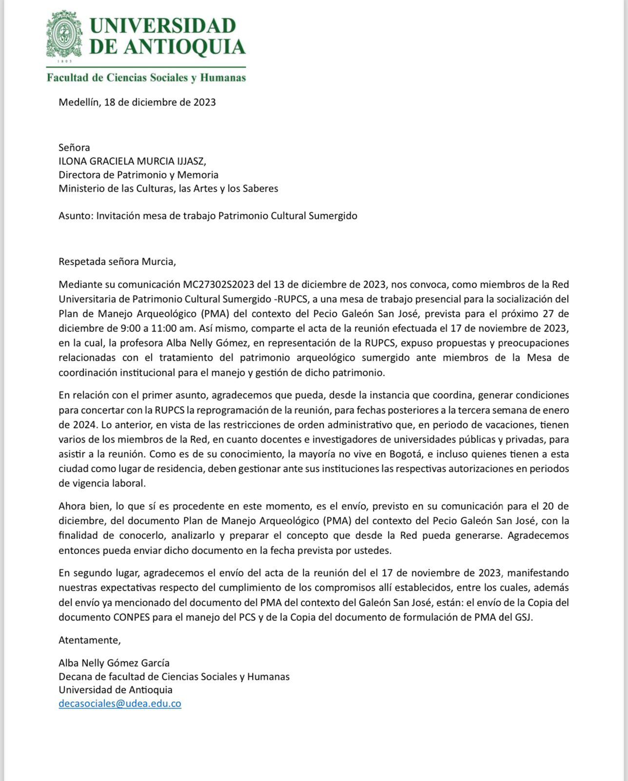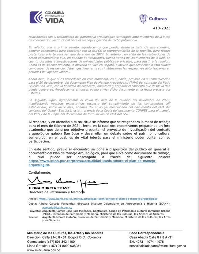 Este medio también conoció la carta que los rectores y arqueólogos más destacados del país le enviaron al Ministerio de Cultura pidiendo reprogramar dicha reunión, teniendo en cuenta que la mayoría de los miembros de la Red Universitaria de Patrimonio Cultural Sumergido se encontraba de vacaciones celebrando la Navidad e, incluso, algunos estaban fuera del país.