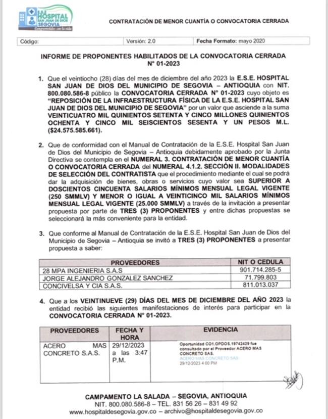 Sigue la W conoció que la junta directiva del Hospital San Juan de Dios de Segovia, el 26 de diciembre de 2023, modificó su manual de contratación, para poder entregar de forma directa un contrato de $28 mil millones de pesos.