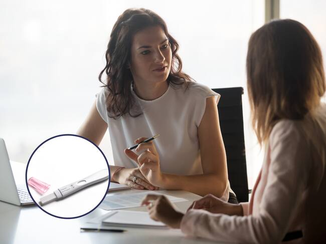 Mujer haciendo una entrevista de laboral o de trabajo para aspirar a un cargo en una compañía. En el círculo, la imagen de una prueba de embarazo / Fotos: GettyImages