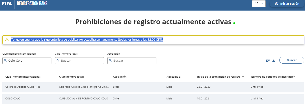 La Fifa dio a conocer su nueva plataforma digital en la que ncluye los clubes sancionados con la prohibición de inscribir jugadores y en la que aparece el club chileno Colo Colo.