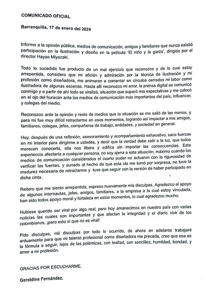 A través de un comunicado a la opinión pública, la ilustradora Geraldine Fernández aseguró que nunca existió su participación en la película ‘El niño y la garza’ de Hayao Miyazaki.