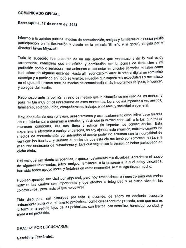 Me arrepiento: Geraldine Fernández se retractó y dijo que no trabajó en estudios Ghibli