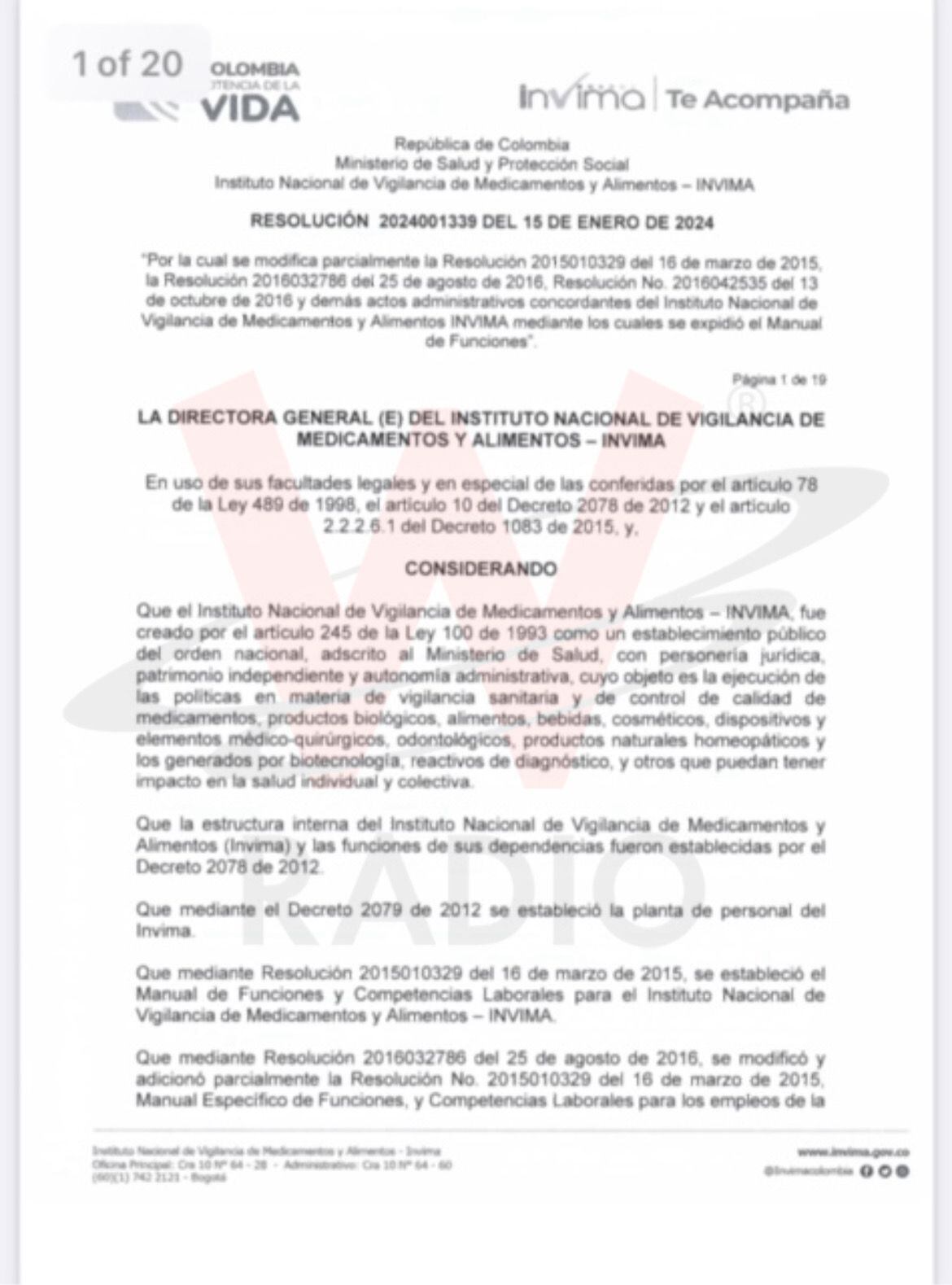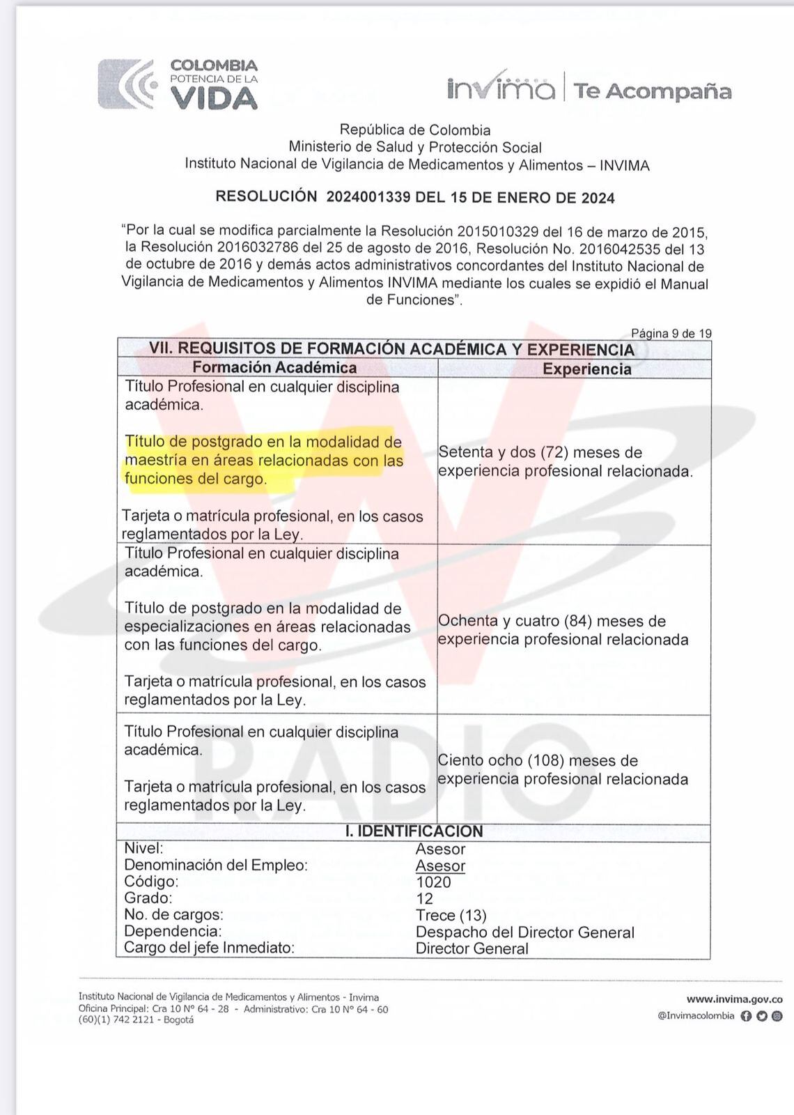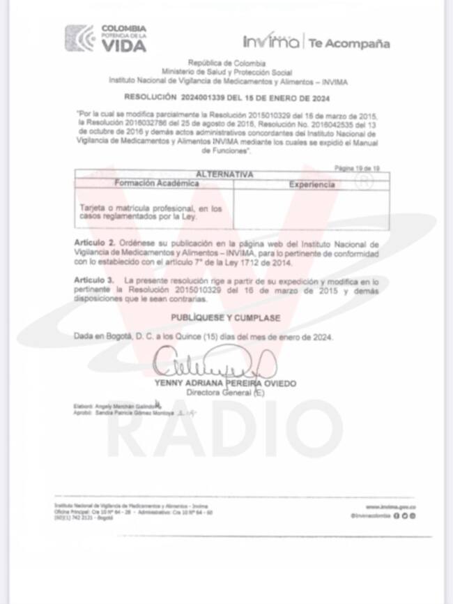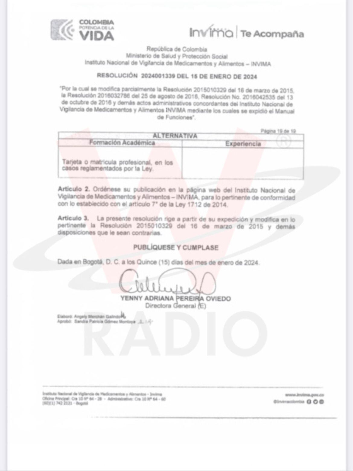 Sigue La W conoció la resolución en firme donde el INVIMA permite que el director nacional de la entidad tenga cualquier título profesional. El documento fue publicado el 15 de enero y firmado por la actual directora encargada, Yenny Adriana Pereira.
