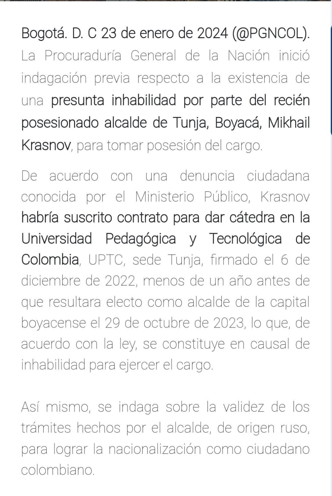 Luego de conocerse el inicio de indagación que adelanta la Procuraduría General de la Nación en contra el alcalde de Tunja Mikhail Krasnov, por una presunta inhabilidad por doble nacionalidad y un posible contrato celebrado con la Universidad Pedagógica y Tecnológica de Colombia (UPTC) a finales de 2022, el mandatario respondió a través de W Radio.