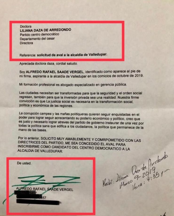 El documento, que se puede ver al pie de esta nota, dice lo siguiente: “Soy Alfredo Rafael Saade Vergel, identificado como aparece al pie de mi firma, aspirante a la Alcaldía de Valledupar en los comicios de octubre de 2019″. La comunicación agrega: “Solicito muy amablemente y comprometido con las directrices del partido, me sea concedido el aval para inscribirme como candidato del Centro Democrático a la Alcaldía de Valledupar”.