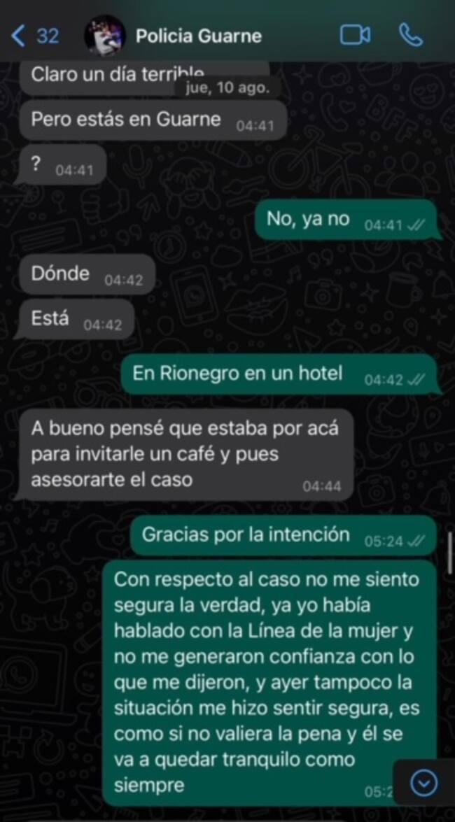 Catherine publicó en Sigue La W las pruebas de que ese día llamó 26 veces a la Policía de Guarne y núnca llegaron “lo único que hicieron por mí fue darme un numero de celular, en esa madrugada yo fui agredida físicamente por mi expareja, el Policía que me atendió se quedó hablando conmigo por WhatsApp y hasta el día de hoy me sigue coqueteando.”