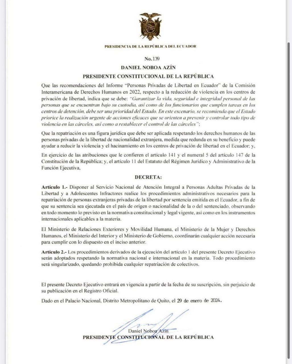 “Yo creo que es una buena noticia y un buen ejercicio de la diplomacia que permite resolver un problema dentro de los cauces de las normas vigentes con un sincero ánimo de colaboración entre los dos países. Debo decir que hasta el momento no he recibido una solicitud concreta del traslados de ninguna persona pero si recibo con beneplácito la decisión del pesidente Noboa”, indicó el Alto funcionario.