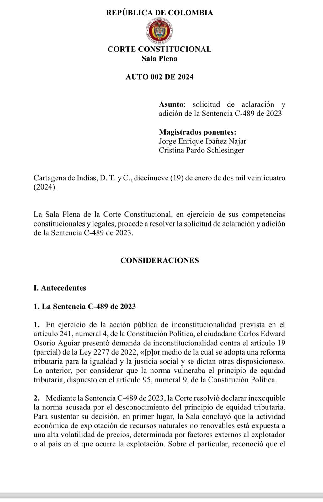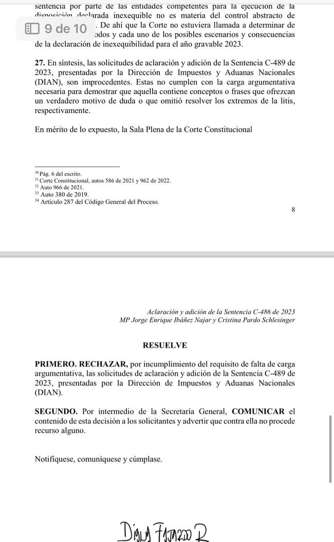 Sin embargo, la Corte Constitucional negó la solicitud bajo el argumento de que es improcedente, porque la pregunta sobre los efectos y consecuencias de la decisión, en relación con el cálculo del impuesto sobre la renta para el año gravable 2023: