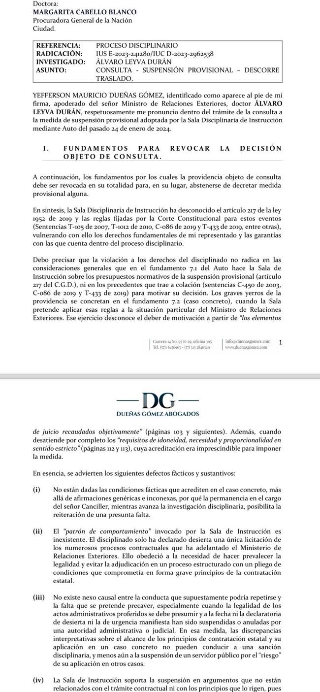 Ahora, lo que alega el abogado Mauricio Dueñas, encargado de la defensa de Álvaro Leyva ante la Procuraduría, es que no se justifica la suspensión en contra del ministro de Relaciones Exteriores, mientras avanza la investigación disciplinaria, además señala que su ausencia abre la puerta a una posible falta.