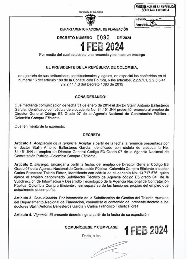 Siguen los movimientos del Gobierno Nacional. El presidente Gustavo Petro aceptó la renuncia de Stalin Ballesteros como director de Colombia Compra Eficiente, entidad que también hace parte del sector de planeación.