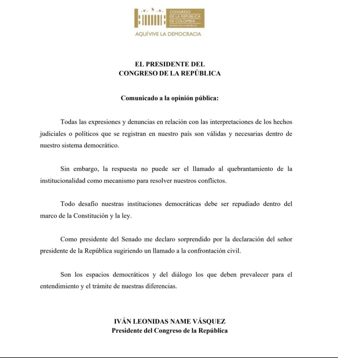 El presidente del Congreso, Iván Name, emitió este viernes un pronunciamiento en respuesta al mensaje de X publicado por el presidente de la República, Gustavo Petro, en la que denuncia una “ruptura institucional” y hace un llamado a las calles.