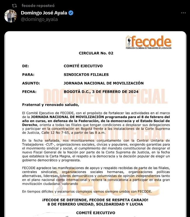 La circular conocida por Fecode asegura que esta protesta se realizará frente a la Corte Suprema de Justicia el próximo 8 de febrero de 2024 con el argumento de que se realizará “en defensa de la Federación, de la democracia y el Estado Social de Derecho”.