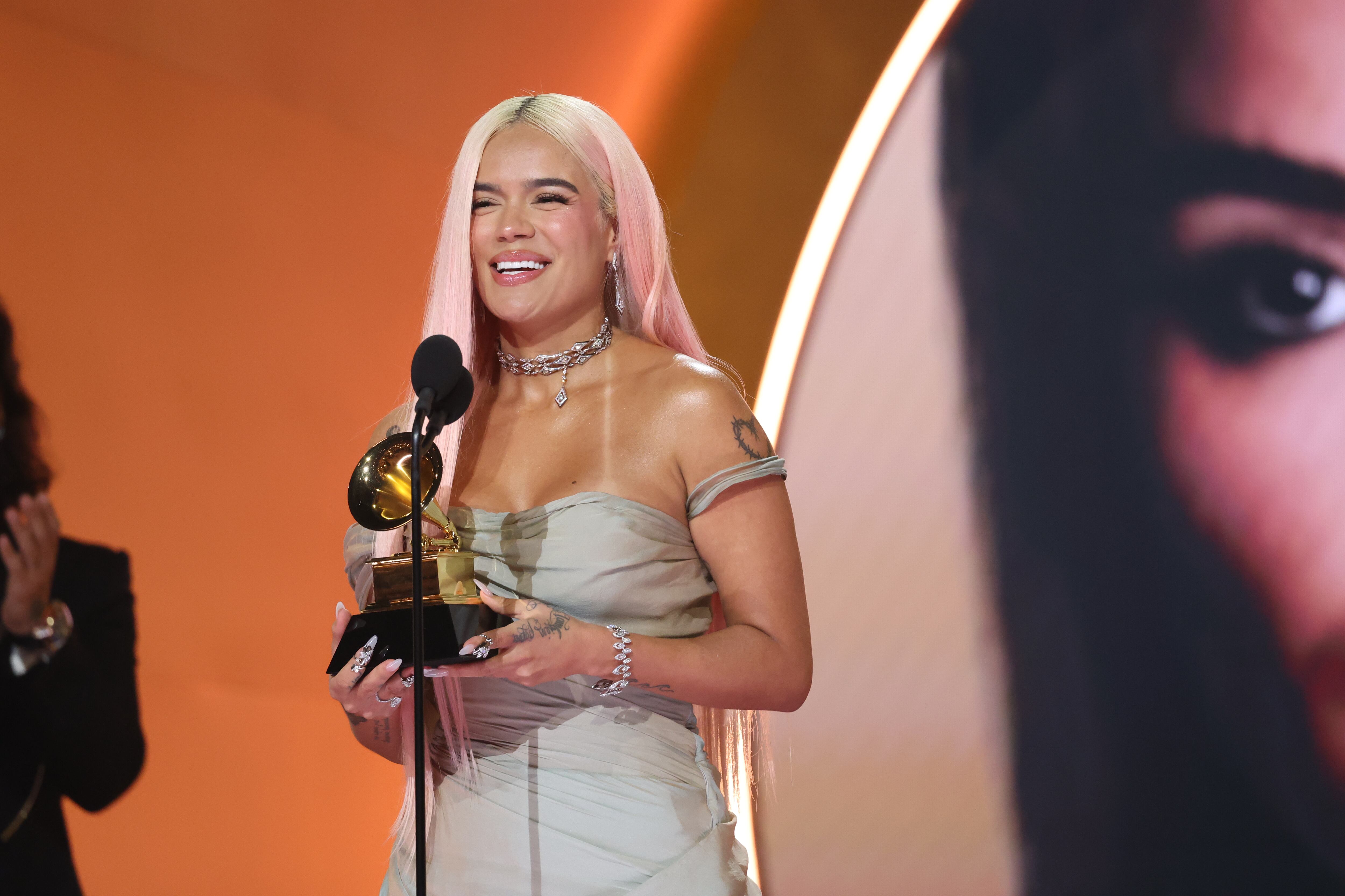 Karol G se convirtió en la primera artista femenina en ganar el premio al mejor álbum de música urbana por “Mañana será bonito”.“Estoy muy feliz de estar aquí frente a tantas leyendas (...) Mi álbum me ha dado las mejores memorias de mi vida”, dijo Karol G después de recibir el premio de manos de Maluma y Christina Aguilera.