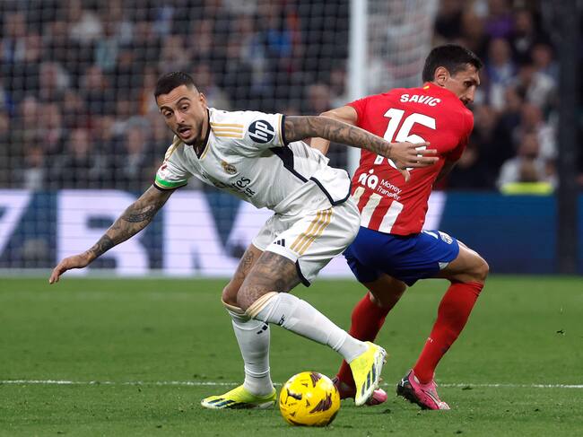 MADRID, 04/02/2024.- El delantero del Real Madrid Pepelu (i) pelea un balón con Stefan Savic, del Atlético, durante el partido de LaLiga de fútbol que Real Madrid y Atlético de Madrid han disputado este domingo en el estadio Santigo Bernabéu. EFE/Juanjo Martín / Juanjo Martín (EFE)