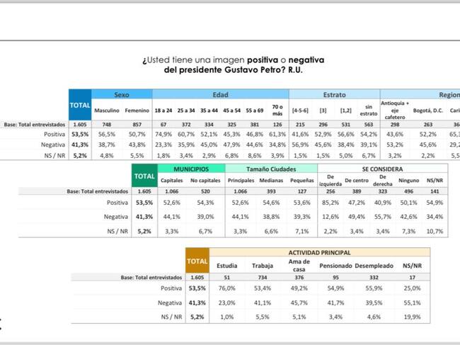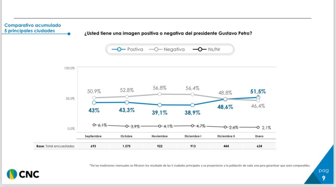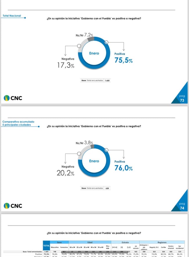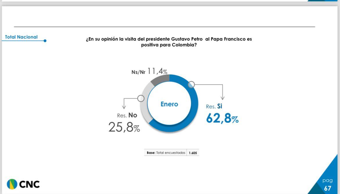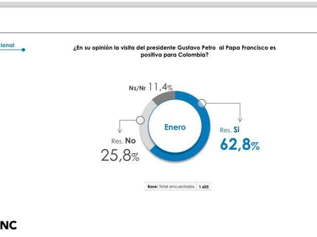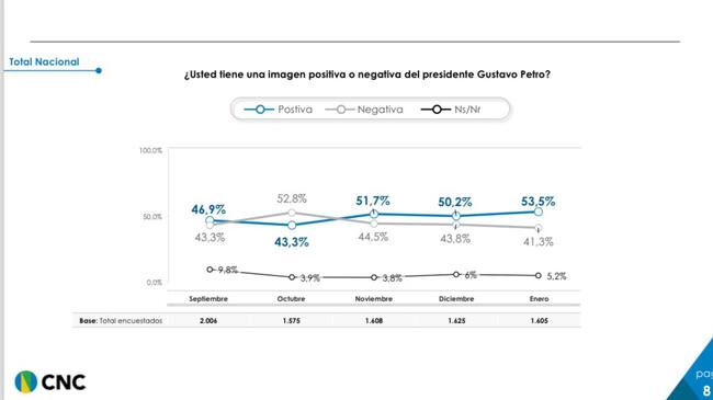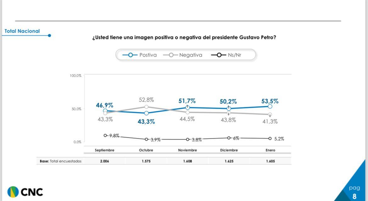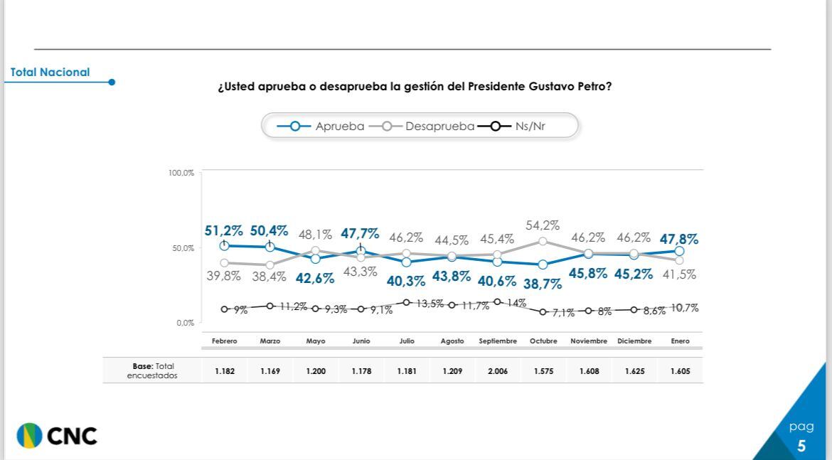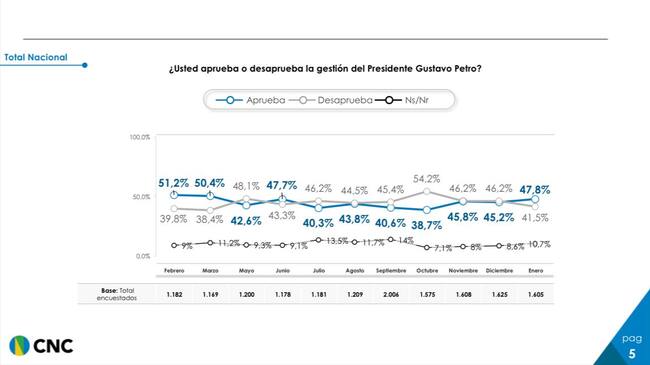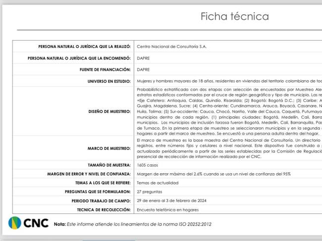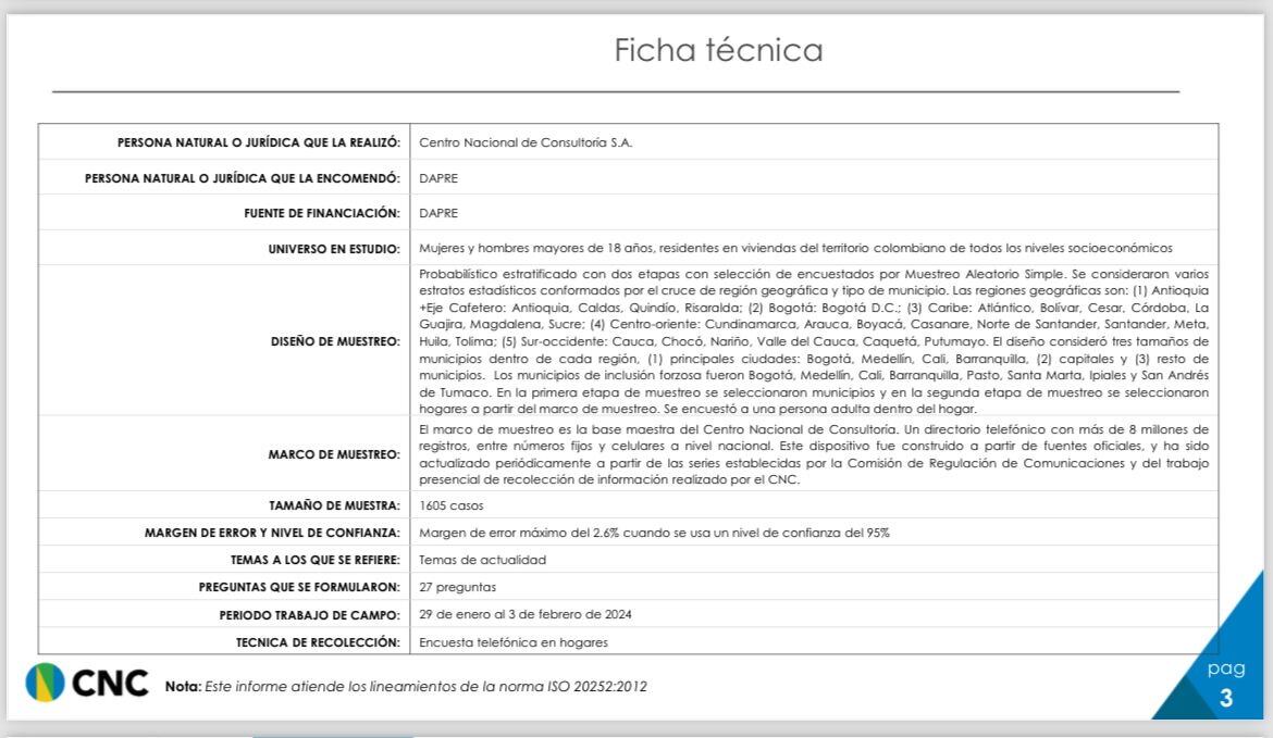 Una encuesta realizada por el Centro Nacional de Consultoría encomendada por el Departamento Administrativo de la Presidencia. La muestra es de 1605 casos, con 17 preguntas realizadas vía telefónica entre el 29 de enero y el 3 de febrero de 2024.