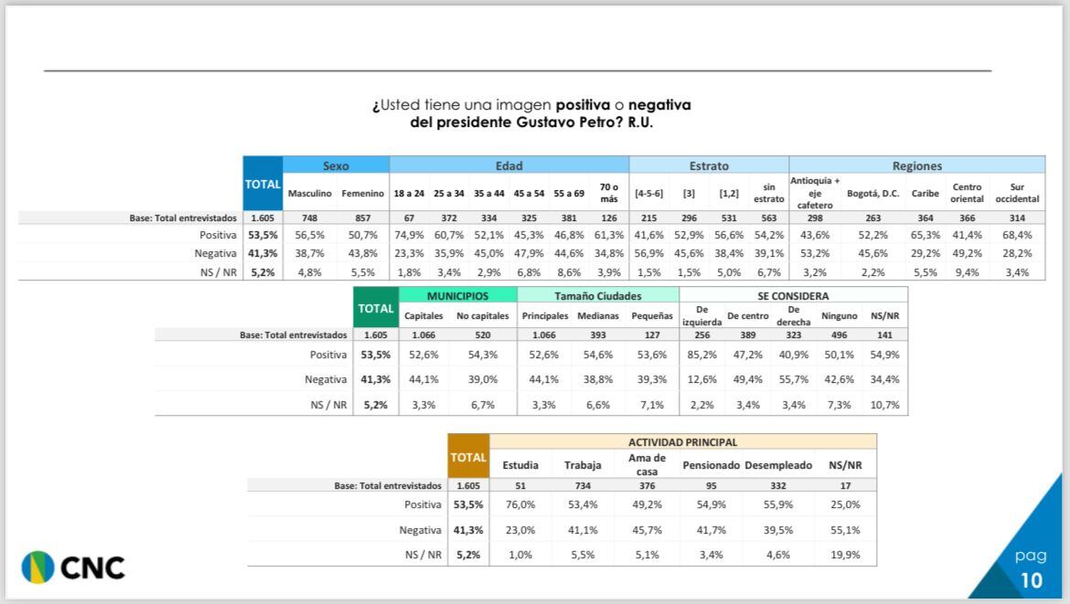 Por su parte, la imagen positiva del presidente Petro también subió (50.2% a 53.5%). Las regiones se comportan igual que en el nivel de aprobación.