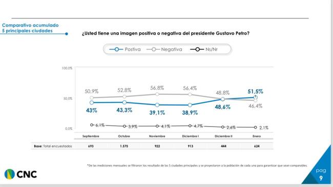 Por ejemplo, uno de los aspectos fue la aprobación al presidente, Gustavo Petro. A nivel nacional, la aprobación del mandatario aumentó de 45.2% a 47.8% de diciembre a enero, la cifra más alta desde junio de 2023.