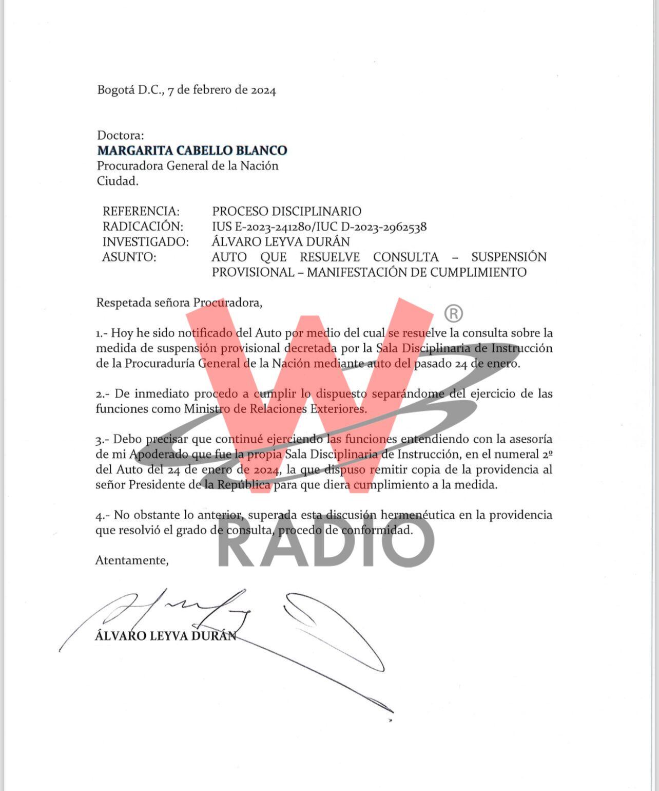 El documento conocido por W Radio tiene 4 puntos en los que el ministro de Relaciones Exteriores, Álvaro Leyva, se dirige a la procuradora Margarita Cabello luego de que se resolviera el auto de la consulta sobre la suspensión provisional que lo separa del cargo por 3 meses.