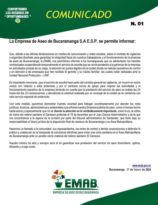 Después de la denuncia hecha en la W sobre la contratación de un escolta VIP para el gerente general de la Empresa de Aseo de Bucaramanga (EMAB) Helbert Panqueva, la entidad emitió un comunicado en donde anunció la suspensión temporal de este servicio que le costaba a la ‘ciudad bonita’ más de 9 millones de pesos mensuales.