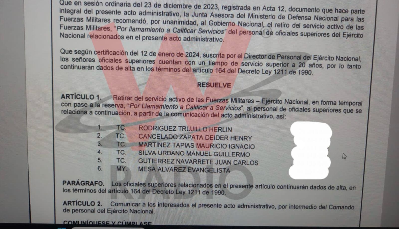 En la resolución se señala que, según una certificación del 12 de enero de 2024, “suscrita por el director de Personal del Ejército Nacional, los señores oficiales superiores cuentan con un tiempo de servicio superior a 20 años, por lo tanto, continuarán dados de alta en los términos del artículo 164 del Decreto Ley 1211 de 1990″, dice el decreto conocido por W Radio, en donde también se confirma la salida de otros cinco militares.