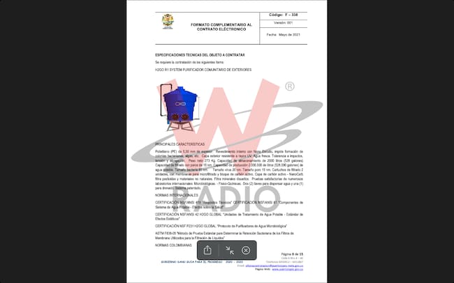 Según la empresa, estos productos tienen todos los certificados que se requieren y en los documentos que tiene La W, están avalados por la NSF, que es una organización que certifica productos y servicios que ayudan a proteger los alimentos, el agua y otros. Sin embargo, a la hora de rectificar en su página web, nos dimos cuenta que los productos de SAVER ASIA (quien es a la que Capital compra los purificadores) no registran en el portal web, aún cuando Capital pone en sus contratos con el departamento del Meta que están avalados.