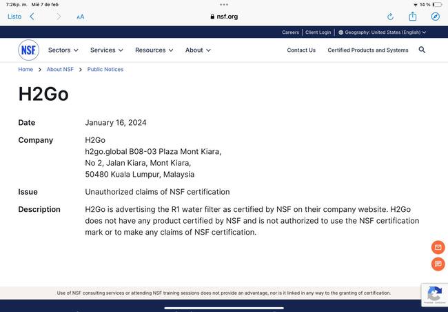 Es muy sencillo mirar si un producto es avalado por la NSF, en su página tienen un buscador. Allí, se escribe el nombre “H2Go” y automáticamente aparece que no están certificados y mucho menos autorizados a usar marcas con el sello de la compañía.