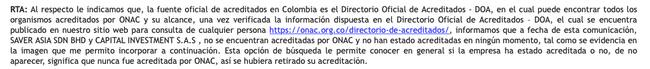 En el país, existe una entidad llamada Organismo Nacional de Acreditación de Colombia (ONAC) que se encarga de verificar que cualquier bien y servicio que se producen y circulan en el país cumplan con requisitos de seguridad y calidad contenidos en estándares internacionales. Al igual que la NSF, tienen un directorio y en ningún lado aparece la empresa asiática Saver Asia, ni Capital Investments.