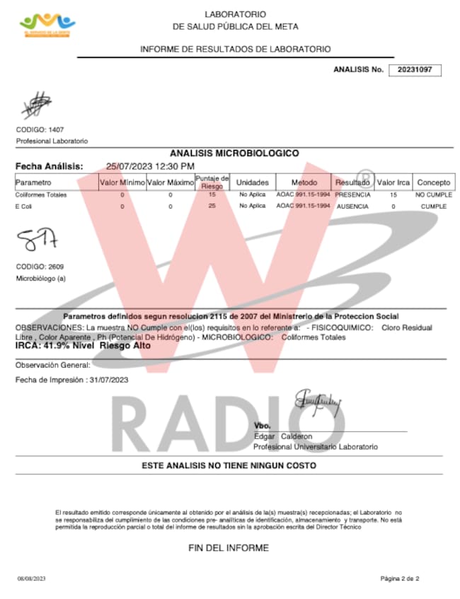 La W tiene en su poder estudios de la Secretaría de Salud del departamento del Meta en donde señalan que el agua de estos tanques purificadores, puntualmente de los centros educativos son alta y medianamente riesgosos.
