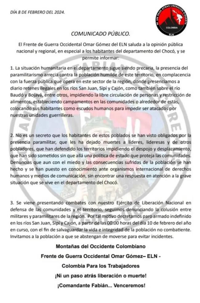 Autoridades departamentales y militares en el departamento del Chocó investigan la aparición de un panfleto en el que, al parecer, se decreta un paro armado por parte de la guerrilla del ELN en los ríos Sipí y Cajón a partir de las “00:00 horas del día 10 de febrero del año en curso”.