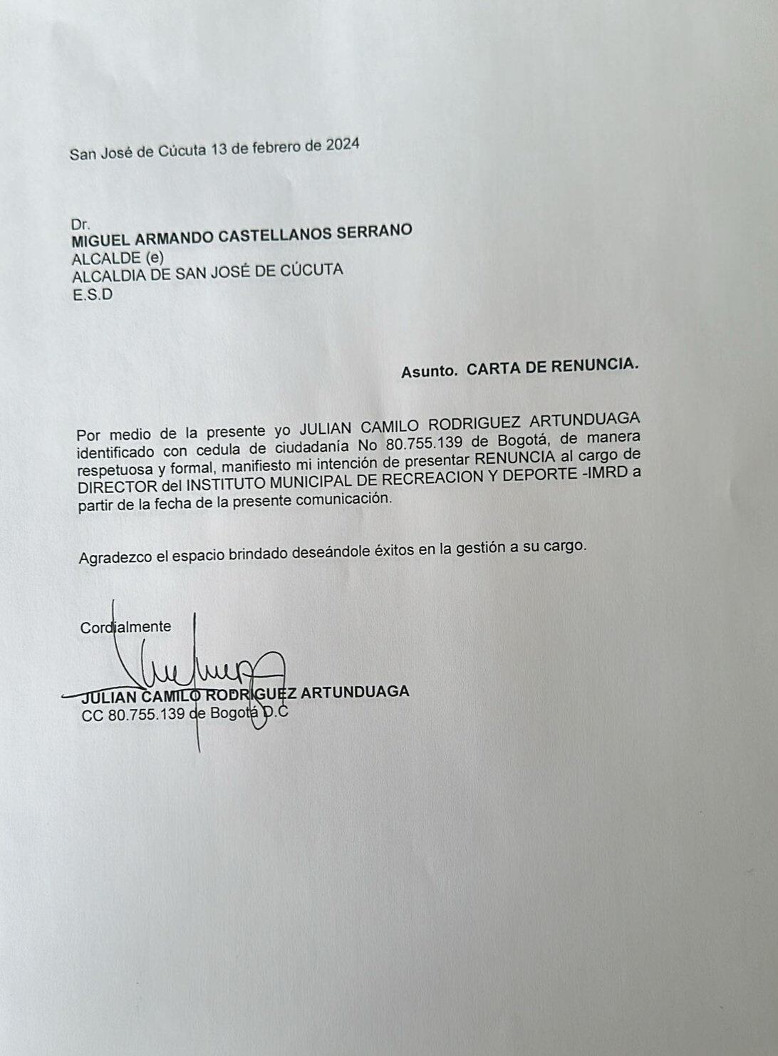 Julián Camilo Rodríguez Artunduaga presentó este martes su renuncia como director del Instituto Municipal de Recreación y Deportes de la ciudad de Cúcuta. El director no expresó en su carta dirigida al alcalde encargado Miguel Armando Castellanos, la razón que lo motivo a tomar esta decisión.