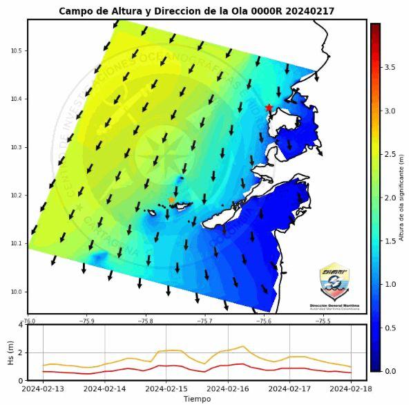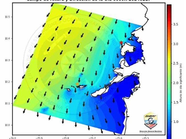 Lo anterior, “debido a la interacción entre un sistema de alta presión (1022 mbar), localizado al noreste de las Antillas Mayores con el sistema de baja presión (1008 mbar) ubicada sobre el centro del litoral Caribe colombiano manteniendo vientos de dirección este-noreste en la mayor parte del territorio marítimo, oscilando entre 22 y 29 nudos (Fuerza 6-7) y una altura de ola significativa que oscila entre 2.8 a 3.5 metros”.