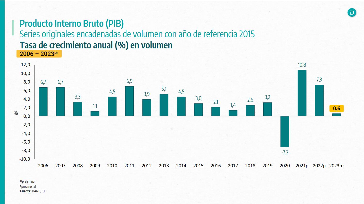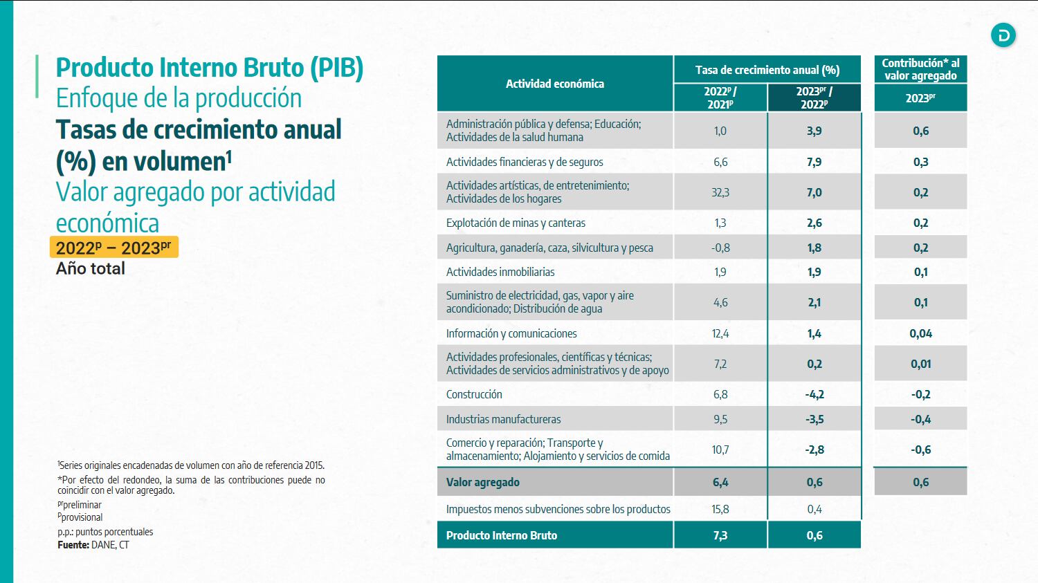 Según cifras del Dane, la economía colombiana durante 2023 creció 0,6%, cifra inferior a la que se había registrado en el crecimiento de 2022, cuando fue de 7,3%.
