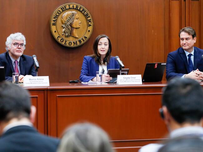 La jefe de la misión para Colombia del Fondo Monetario Internacional (FMI) Ceyda Oner habla junto a los economistas senior del FMI Roberto Perrelli (d) y Marco Arena durante una rueda de prensa este miércoles, en la sede del Banco de la República en Bogotá, (Colombia). El FMI destacó este miércoles el "progreso encomiable" de Colombia en el último año para avanzar hacia una actividad económica más sostenible, pero advirtió de riesgos en el horizonte. EFE/ Carlos Ortega / Carlos Ortega (EFE)