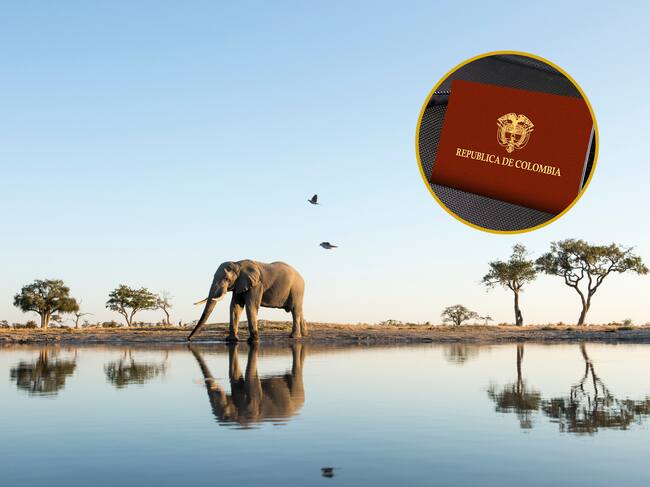 Elefante en el Parque Nacional Chobe de África. En el círculo, pasaporte de Colombia (Fotos vía GettyImages)