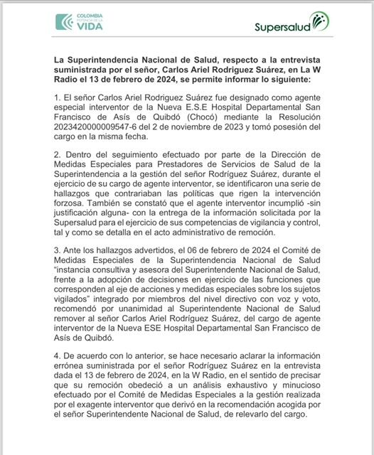 Finalmente, desde la SuperSalud enviaron un comunicado de prensa en donde informan que lo denunciado por el exinterventor carece de realidad y que sus afirmaciones son una violación en contra de la delegada Beatriz Gómez, incluso afirman que a él lo sacaron de la entidad por extralimitarse en sus funciones y no entregar la información que en su momento se le solicitó,