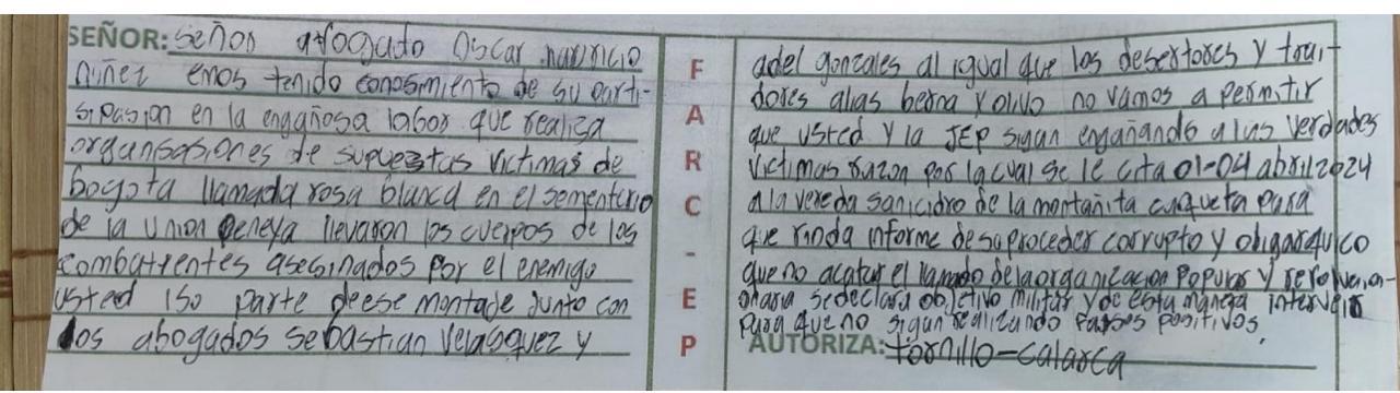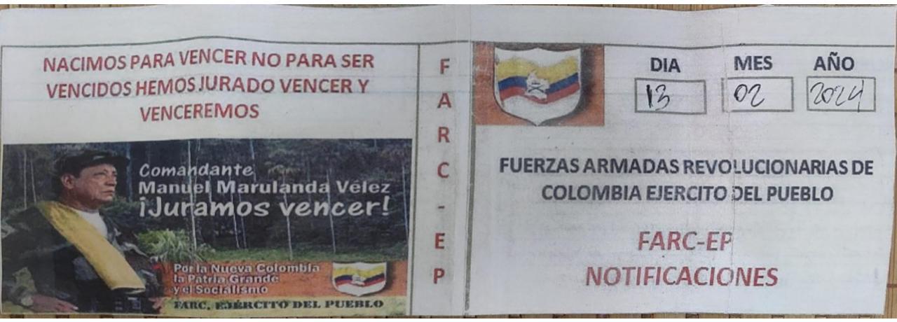 “Tiene la firma de un señor ‘Tornillo’ y un señor ‘Calarcá’. Desconocemos si son comandantes de disidencias que hoy operan en la zona y no sé si ‘Calarcá’ se refiera al que le acaban de levantar orden de captura. Eso lo definirán las investigaciones de la Fiscalía”, agregó Velásquez.