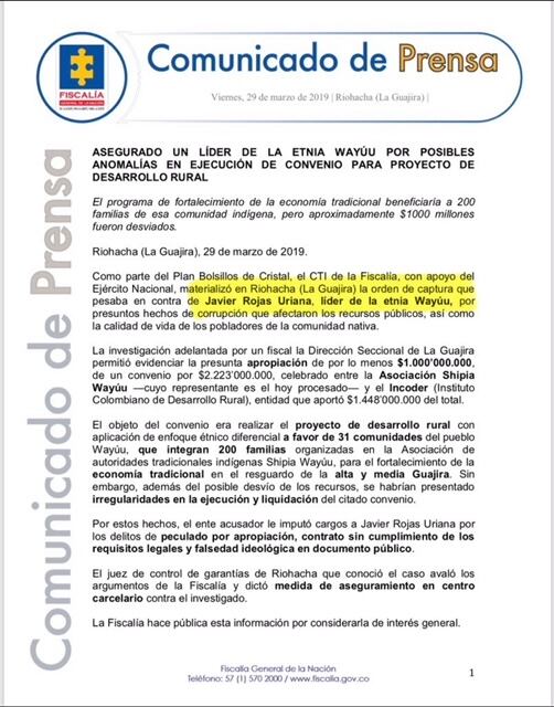 En el video Olmedo López revela que el negoció se gestó en la oficina de Javier Rojas. Frente a ello Sigue la W conoció que este hombre es un reconocido líder indígena quien lleva muchos años gestando diferentes negocios alrededor de las necesidades de La Guajira, incluso en el año 2019 fue capturado por el CTI de la Fiscalía por anomalías en la ejecución de un convenio en donde fueron desviados aproximadamente mil millones de pesos.
