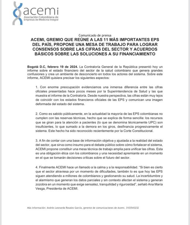 En medio de la creciente preocupación generada por las discrepancias en las cifras financieras del sector de la salud en Colombia, la Asociación Colombiana de Empresas de Medicina Integral (ACEMI), gremio que reúne a las 11 más importantes EPS del país, ha propuesto la creación de una mesa de trabajo para lograr consensos y acuerdos básicos sobre las soluciones a su financiamiento.