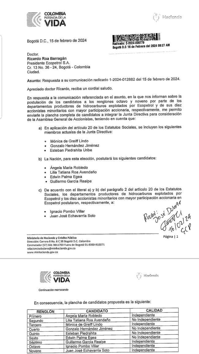 Pues en una carta enviada al presidente de la petrolera, Ricardo Roa, el Ministerio de Hacienda envió la plancha de los nueve postulados que llegarían a la junta de la petrolera.