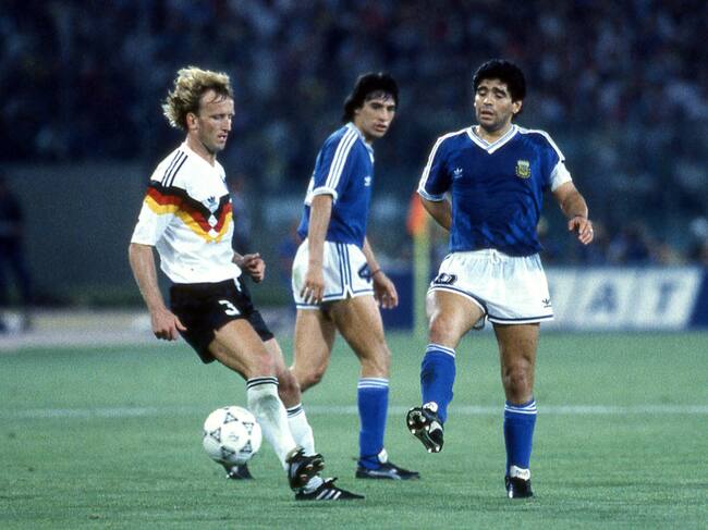 Andreas Brehme, futbolista alemán (izquierda) y Diego Armando Maradona, futbolista argentino (derecha) en la final del Mundial Italia 1990. Foto: Getty Images. / Alessandro Sabattini
