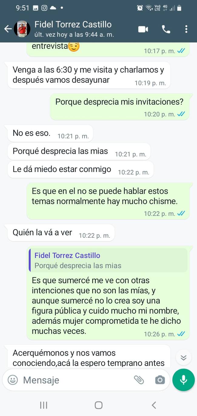 “Una mujer, cuando se siente acosada ya no quiere ni siquiera hablar con la persona, ni le quiere contestar el teléfono, pero yo tenía clarísimo que yo como mujer no me iba a rendir, para mi ver la actitud de esa persona es lamentable porque estaba representando los intereses de un Gobierno, me dijeron que iba a tener el respaldo del presidente”, añadió.