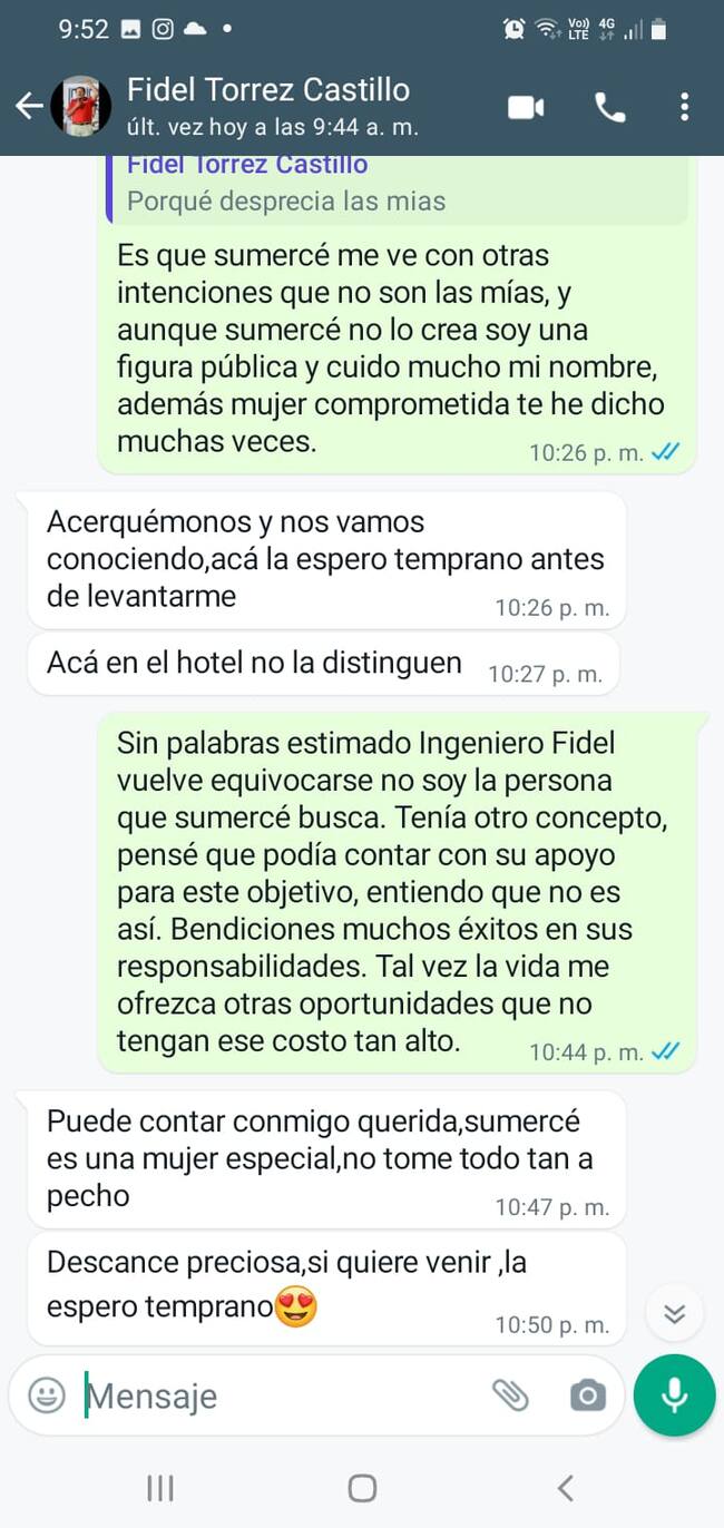 En respuesta a esta grave denuncia, el ingeniero Fidel Torres negó que hubiera acusado sexualmente a la ingeniera. Sobre los chats y audios presentados aseguró que es un trato que el normalmente utiliza con las personas cercanas, “es mi forma normal de tratar con cariño, cada cual tiene una manera de interpretar las cosas.”
