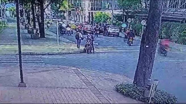 En el video se ve a uno de los presuntos delincuentes subiendo a una moto que intenta arrancar sin éxito en varias oportunidades, mientras otros dos hombres los persiguen en medio del cruce de disparos.