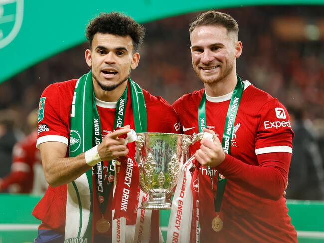 Luis Díaz junto a Alexis Mac Allister celebrando el título de la Copa de la Liga. (Photo by Nigel French/Sportsphoto/Allstar via Getty Images) / Nigel French/Allstar